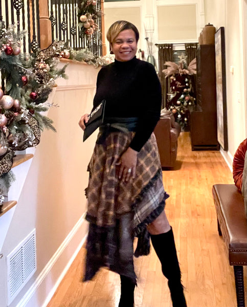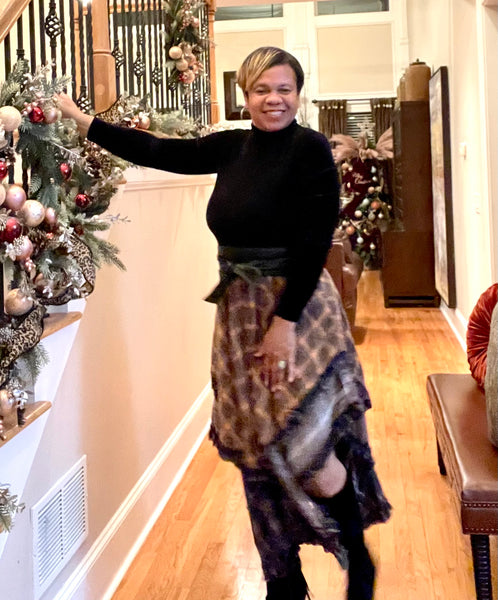 Catch them off guard in this multi layered , uneven, multi pattern skirt