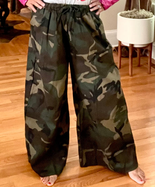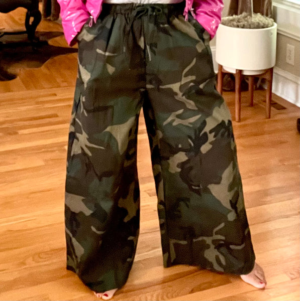 If you love wide legs and you love camo, these pants are for you. Pair them with red, orange, or pink for a pop of color … drawstring waist… no stretch… has pockets