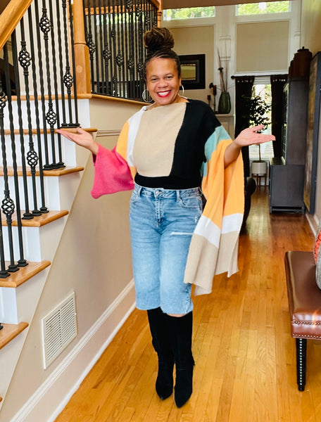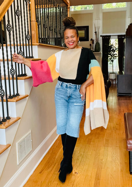 Work the crops. It’s a cropped sweater paired with cropped jeans. The perfect duo. sweater is Onesize… jeans sold pounder Junki bottoms